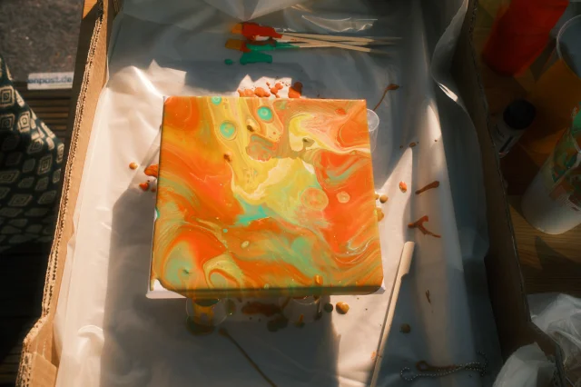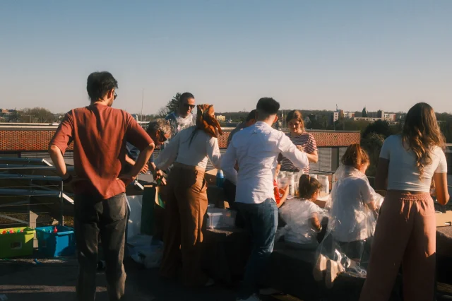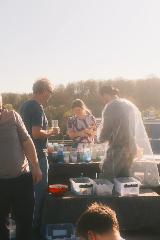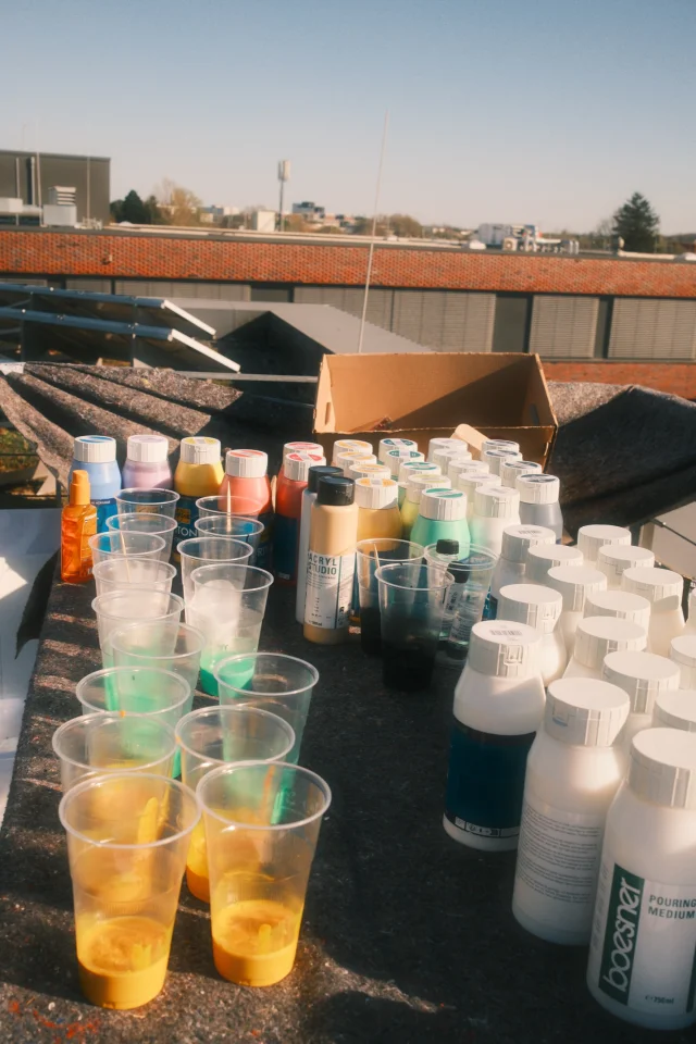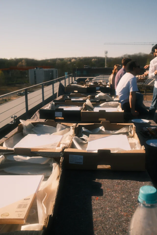 Mit diesem Satz startete die Idee zu unserem diesjährigen get together am 04.04.2025. Das gesamte Büro traf sich diesmal bei sonnigem Wetter auf der Dachterasse des Etrium, um zusammen kreativ zu werden. Unter zu Hilfename von viel Pizzastärkung entstanden kleine Kunstwerke, die seitdem unser Büro schmücken.